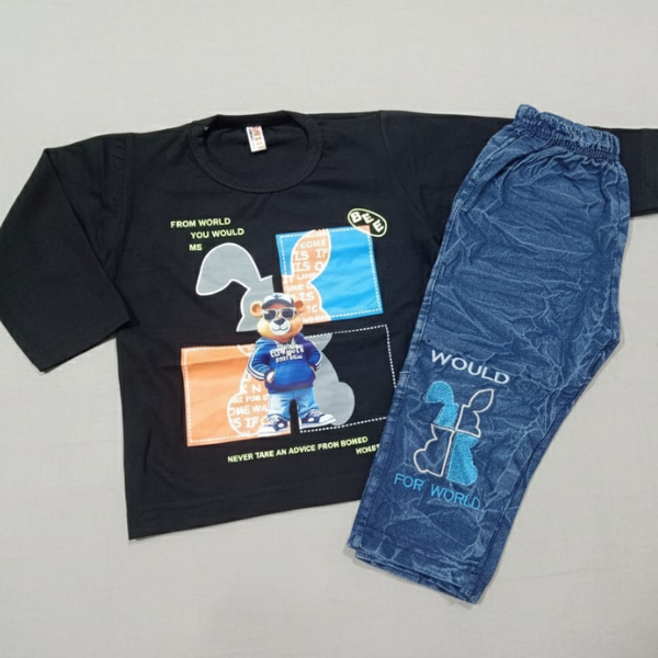 Trendy boys’ black t-shirt and blue pants set featuring a fun cartoon bear print and stylish patch designs — perfect for casual wear and everyday comfort.